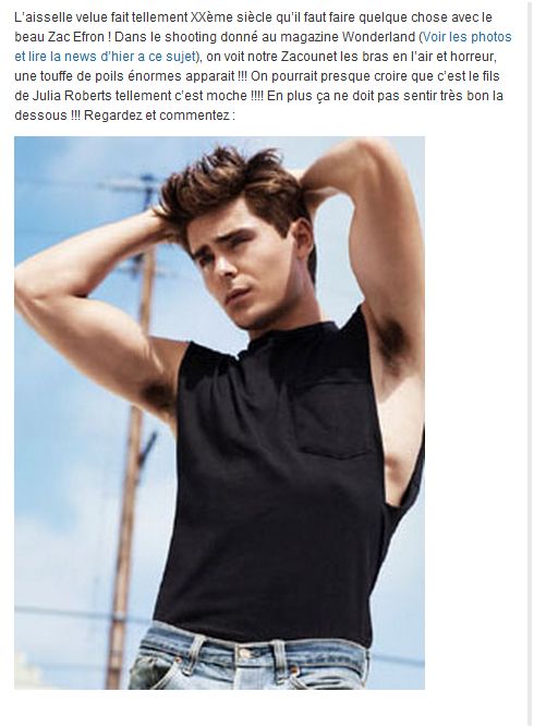 j'ai toujours du mal avec ce sujet, ça dépend tellement de comment on est 'au naturel', des poils fins, clairs, sur une peau claire ... c'est facile de dire "je suis pas une maniaque du rasoir ou de l'épilation" et faire la leçon aux copines ;o) ça dépend de ce qu'on fait aussi, de ce qu'on porte (j'écris ça en rapport aux messages qui évoquent "l'hiver" ou la tenue portée). Je vais à la piscine toute l'année, on ne passe pas son temps à observer nos pilosités, mais c'est vrai les hommes ne sont pas poilus sous les bras, ils élaguent (je suppose ;o) ... Des aisselles comme celles de Zac Effron sur la photo, j'en vois pas ... Le plus important c'est la santé humaine, si s'épiler est prendre un risque (l'épilation intime en est un) il faut bien entendu l'éviter et lutter contre un diktat, a fortiori s'il vient de la pornographie. Pour le reste, on rejoint les stéréotypes sexistes et les stéréotypes esthétiques.